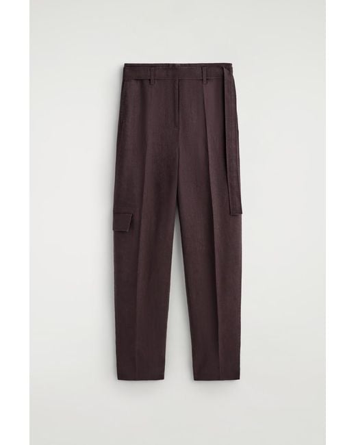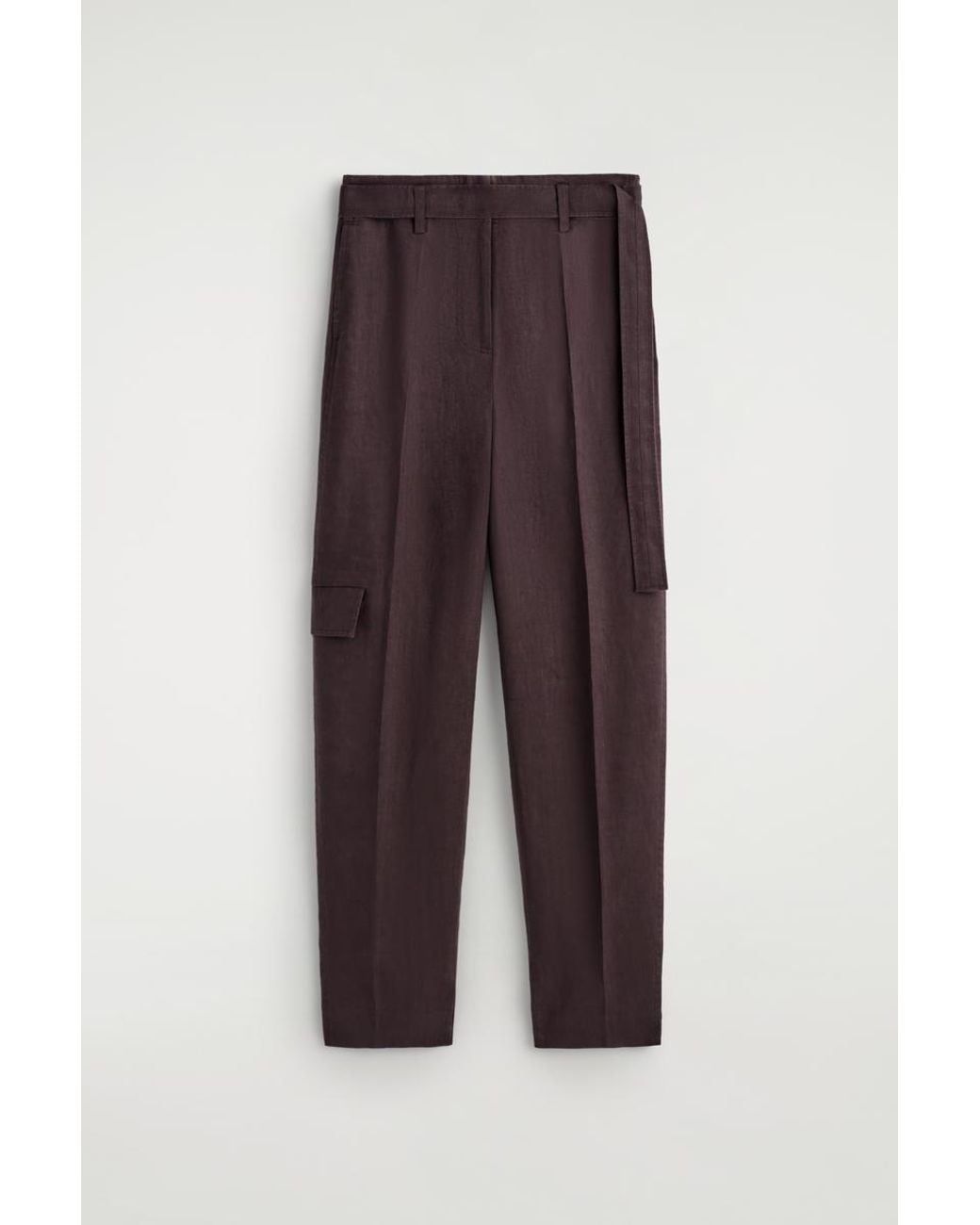These modern trousers offer a minimal take on utility. Designed in a barrel-leg shape, they're made from light, tactile linen and feature an elongated belt, workwear-inspired pockets and slits at each ankle. Regular fit. Hook, bar and zip closure. Machine wash Inside leg length of size EU 36 is 74.8cm / Model wears a size EU 36 COS Women's Belted Linen Barrel-Leg Trousers in Red