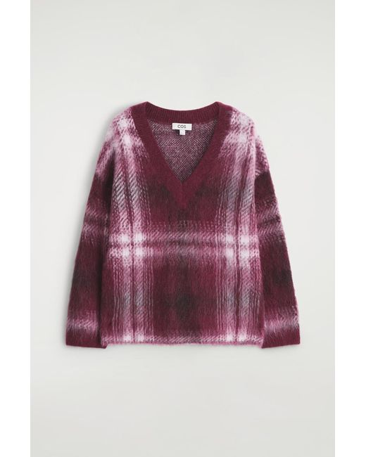 For Autumn Winter 2025, heritage-inspired checks reframe wardrobe signatures with a renewed appeal. This jumper is crafted with luxuriously soft alpaca and wool that's brushed for rich texture and designed with a deep V-neckline. Style it with denim for an effortless look. Regular fit. This product contains Responsible Alpaca Standard TE-00047206 (RAS) alpaca fibre from farms certified to animal welfare and land-management requirements Shell: 38% RAS alpaca, 38% RWS wool, 24% Recycled polyamide (Recycled nylon). Excluding trims / Dry clean Back length of size S is 64cm / Model wears a size S COS Women's Checked Alpaca-Blend Jumper in Red Colour: purple