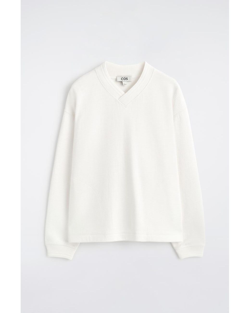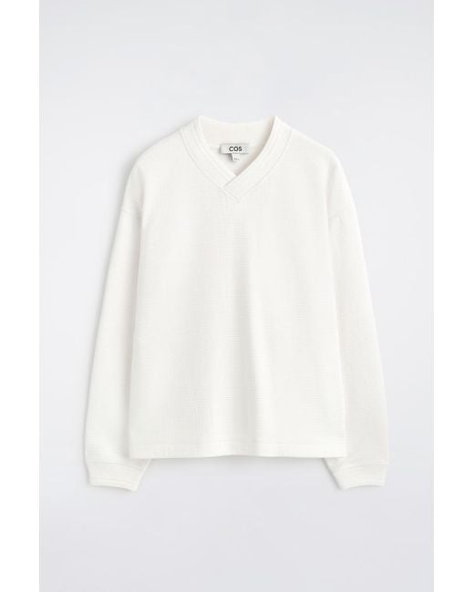 Adding a preppy spin to the classic V-neck, this sweatshirt is made from waffled cotton with a layered neckline and dual-entry kangaroo pockets. Style it with denim for laid-back appeal. Relaxed fit. Machine wash Back length of size M is 64cm / Model wears a size M COS Men's Waffle-Knit Cotton V-Neck Sweatshirt in White Colour: white