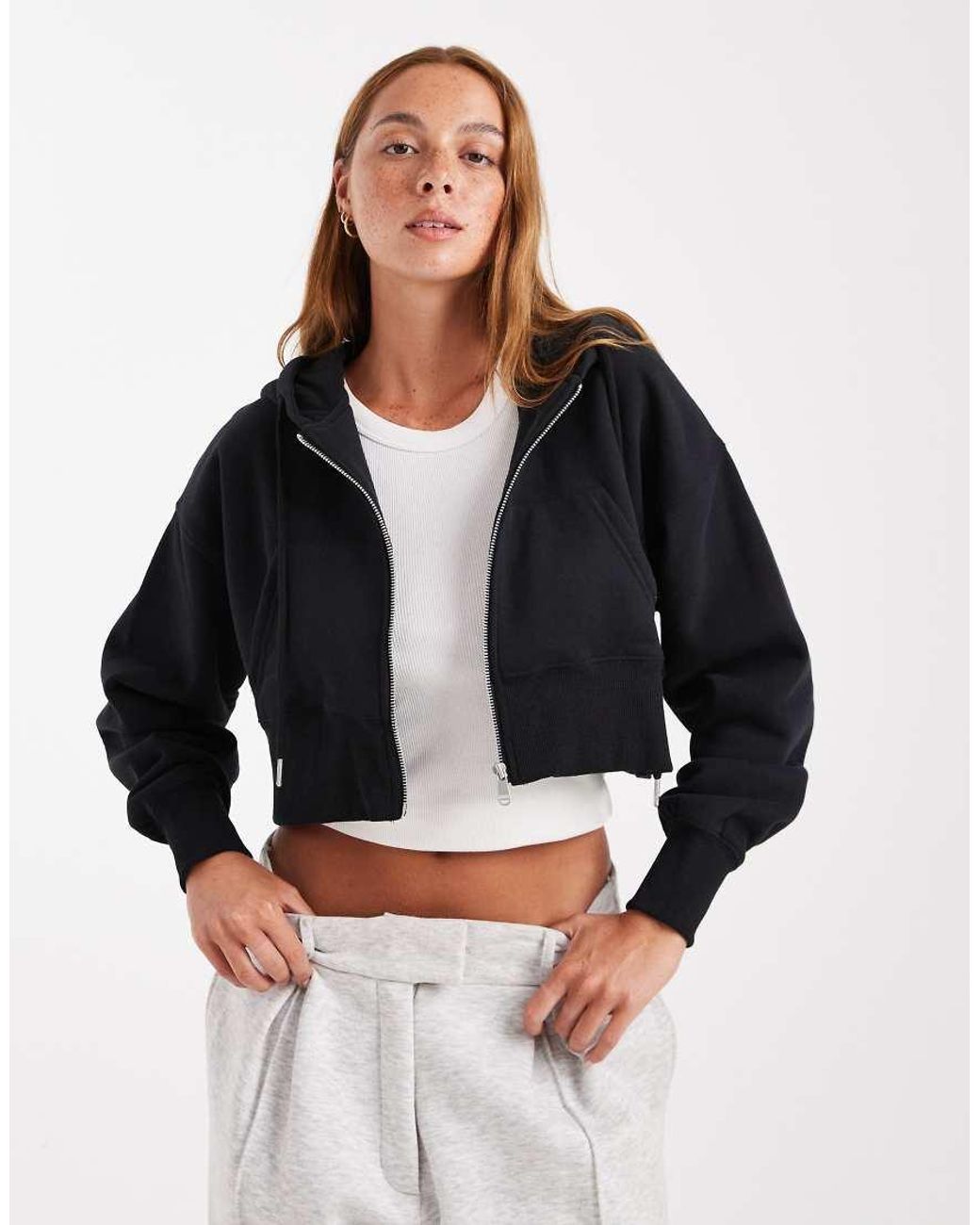 Hoodies & Sweatshirts by Cotton:On Drawstring hood Zip fastening Side pockets Long sleeves Ribbed trim Cropped cut Regular fit. Colour: black