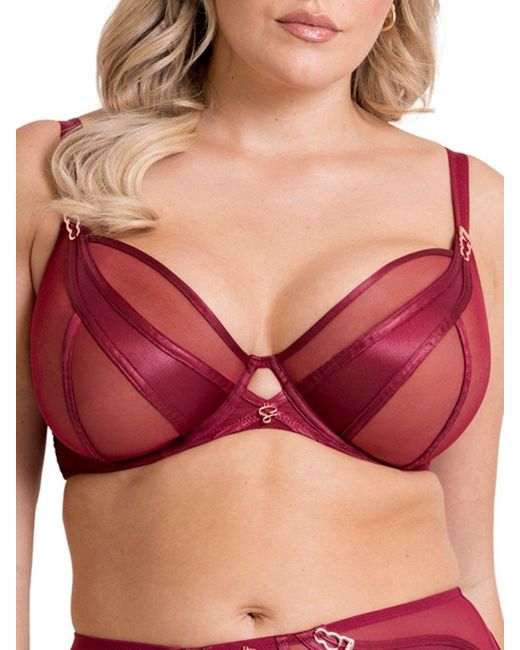 Curvy Kate Scantilly Suspense Plunge Bra. Underwired non-padded plunge bra with sheer mesh cups, satin panels and rose gold hardware. This product is recommended as hand wash only. Colour: red