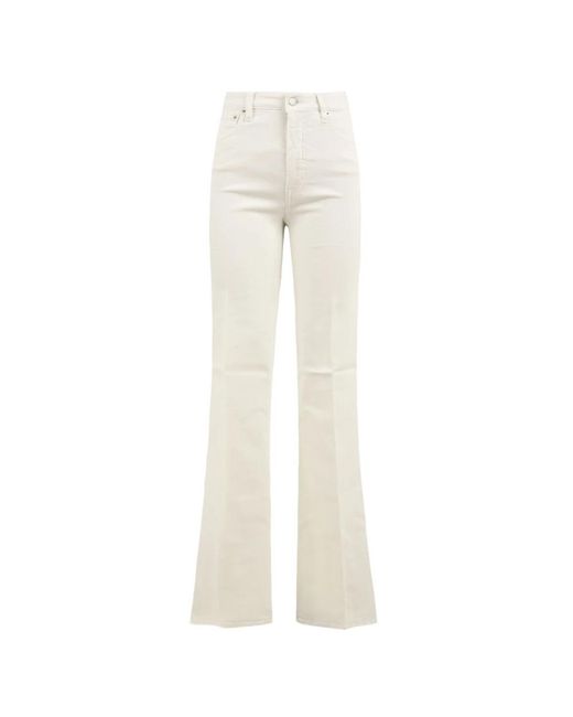 Cycle High Rise Flared Jeans combine a high-waist silhouette with an extra-long flared leg and centre crease for a polished, elongating look. Constructed in stretch bull denim and finished in a direct-dyed white, they balance comfort with statement shaping. Key attributes: White | Bianco Panna | Cotton-blend bull denim | Stretch fabric | Direct dyeing | Five-pocket styling | Zip fly and button closure | Stretch for added comfort | High waist | Extra-long flared leg | Centre front and back pleat with stretch crease | Crossed back belt loops echoing the logo | Plated logo detail on back right pocket | Dimensions & fit: High-waist flare fit | High rise | Extra-long flared leg with centre front and back crease | Composition & care: 93% Cotton, 5% Polyester, 2% Elastane | Machine wash cold, gentle cycle. Do not bleach. Line dry or tumble dry low. Warm iron if needed. Colour: white