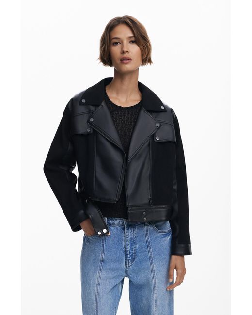 Women's Blue Combined Faux Leather Jacket, Polyurethane