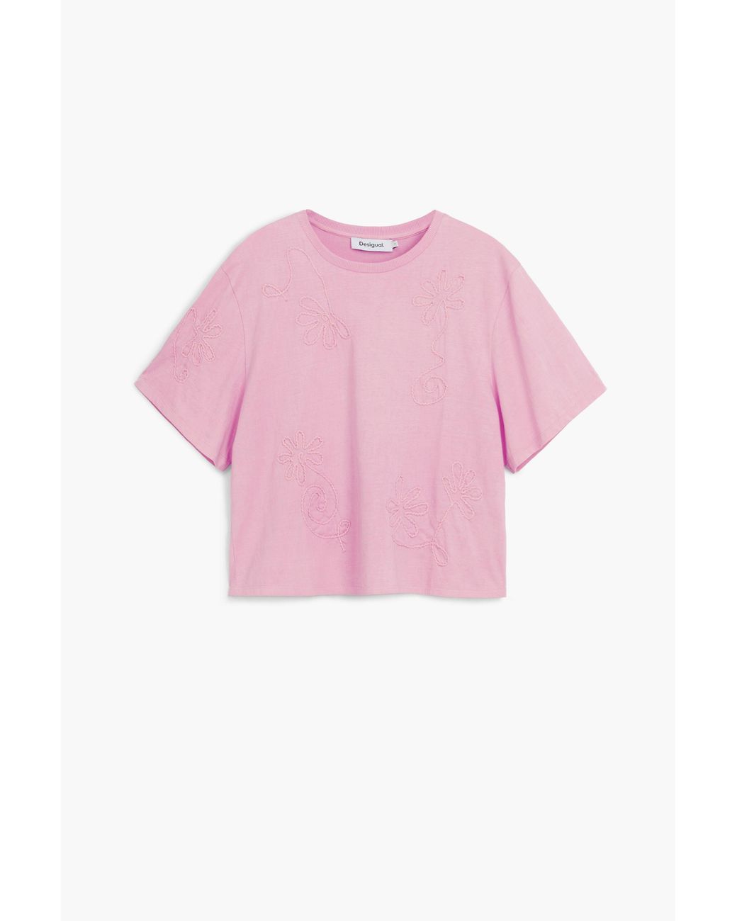 Women's Pink Embroidered Flower T-Shirt, Cotton
