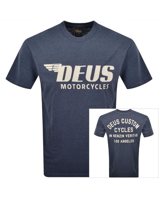 Deus Ex Machina Palermo T Shirt In Blue Box Fit. A cotton jersey t shirt with a ribbed crew neck and short sleeves. The Deus Ex Machina logo is incorporated on the chest in a motorcycle themed print with large text on the reverse. 40% Cotton 50% Polyester and 10% Viscose Colour: blue