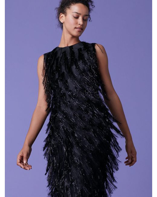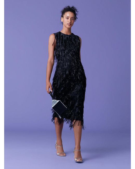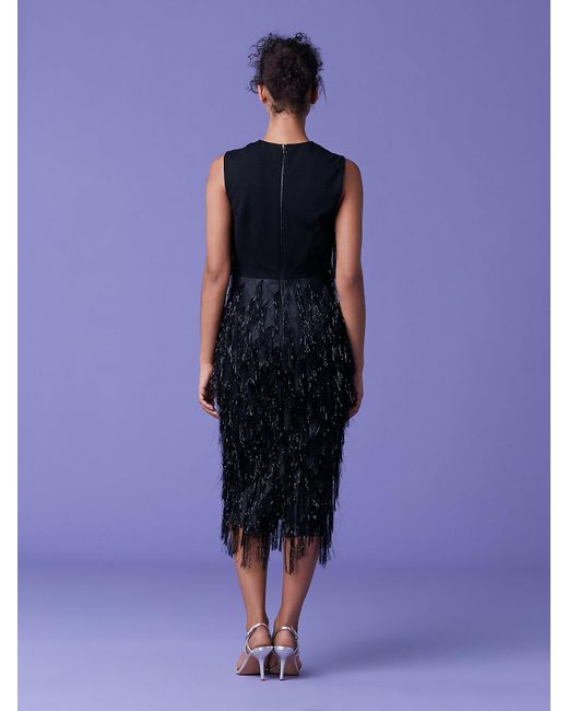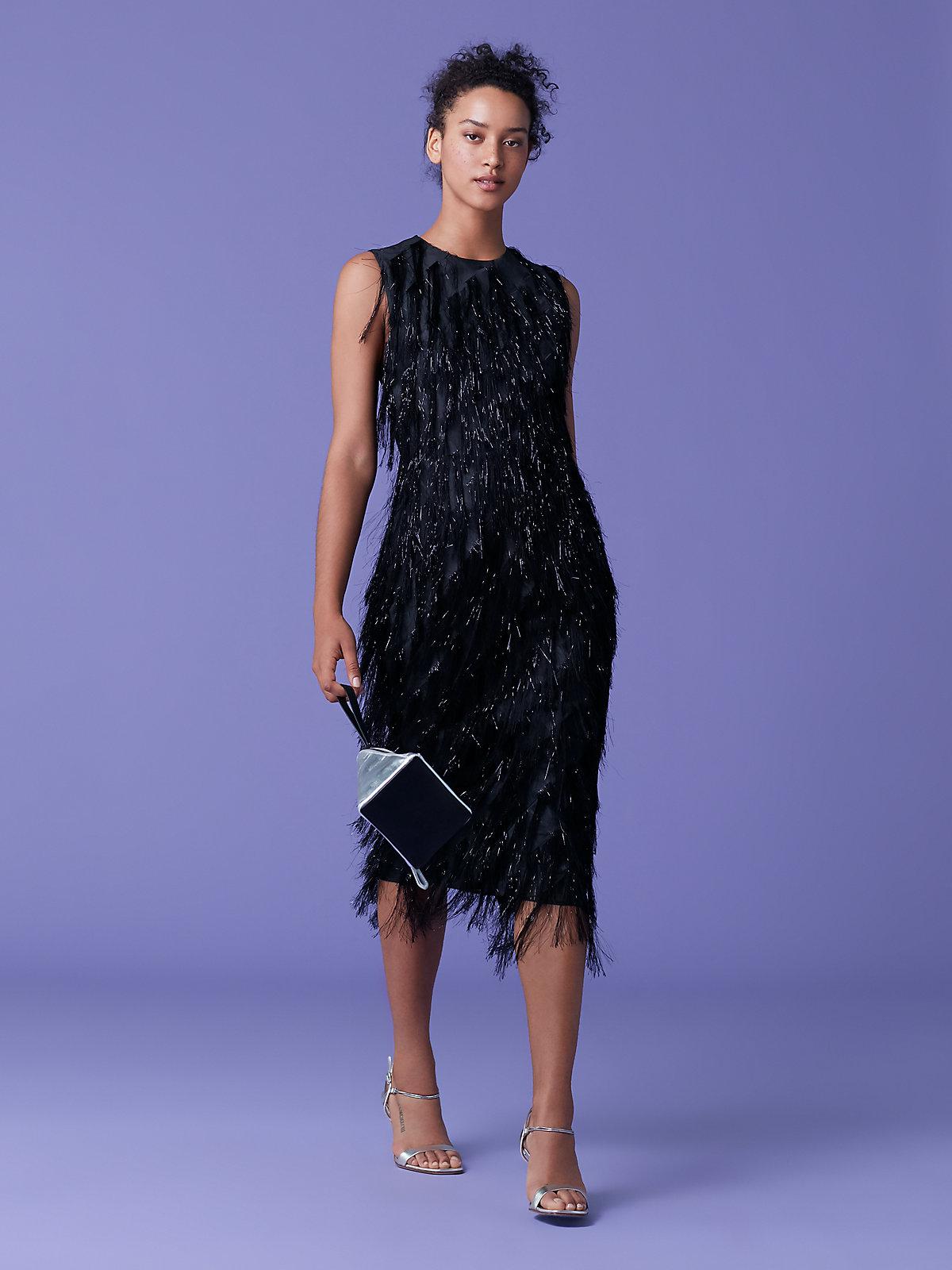 The metallic fringe front on this black crewneck sheath is a showstopper this season. With a fringe-less back with a quick zip and its viscose/metallic poly blend, it's metallic fringe bottom makes for the perfect twirl. The metallic fringe front on this black crewneck sheath is a showstopper this season. With a fringe-less back with a quick zip and its viscose/metallic poly blend, it's metallic fringe bottom makes for the perfect twirl. Flora is 5'8 and wears a Size 2. Worn with. Triangle Minaudière. 48% Viscose 32% Metallic 20% Polyester. 56cm / 22" from natural waist. Colour ID: BLACK. Add to Wish List. Colour: black