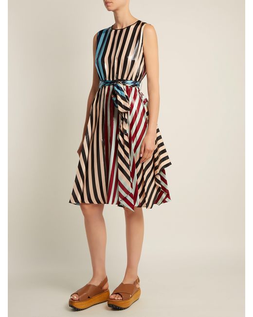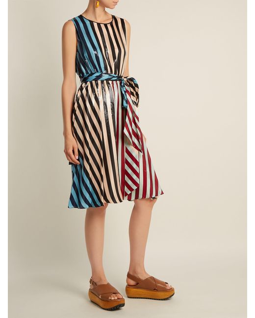 Diane von furstenberg - diane von furstenberg's eclectic and elegant use of colour and pattern is illustrated by this carrington stripe dress from the label's aw18 collection. The soft silk-blend is made with metallic accents, and the relaxed silhouette of the piece is drawn in by a matching waist tie. Style yours with contemporary sandals in a muted colour palette. 70% silk 30% metallic. Colour: multicolour