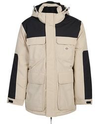 Go to MiintoStay warm and stylish with this long down jacket from Dickies. Made of waterproof ripstop fabric, this jacket features a high neck, adjustable hood with elastic drawstring, zip closure, side pockets, one internal