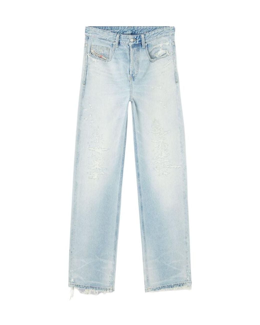 Low waist, drop crotch, wide leg, button placket and distressed finish. Colour: blue