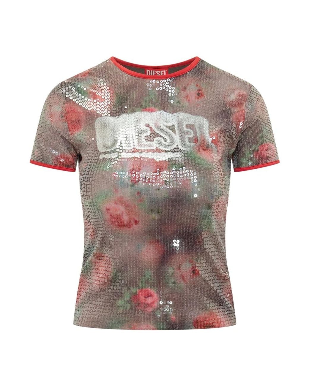 Diesel T-Unkyel T-shirt pairs a fitted silhouette with sequin-effect applications for a bold, statement-ready top. The piece stands out for its all-over floral print and subtle logo detail. Key attributes: Multicolour | Polyamide | Stretch fabric | Crew neck | Short sleeves | All-over floral print | Sequin-effect embellishment | Logo detail | Solid-color trims on collar and sleeves | Dimensions & fit: Fitted line | Skinny fit | Composition & care: 82% polyamide, 18% elastane | Embroidery yarn: 100% polyester | Application: 100% polyester | Dry clean. Colour: pink