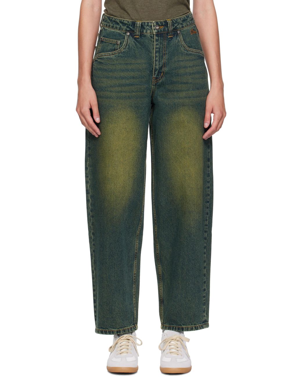Non-stretch denim jeans. · Pre-shrunk · Fading and whiskering throughout · Belt loops · Five-pocket styling · Zip fly · Logo embroidered at front pocket · Logo patch at back waistband · Contrast stitching in tan Supplier color: Sandblasted pine Colour: green