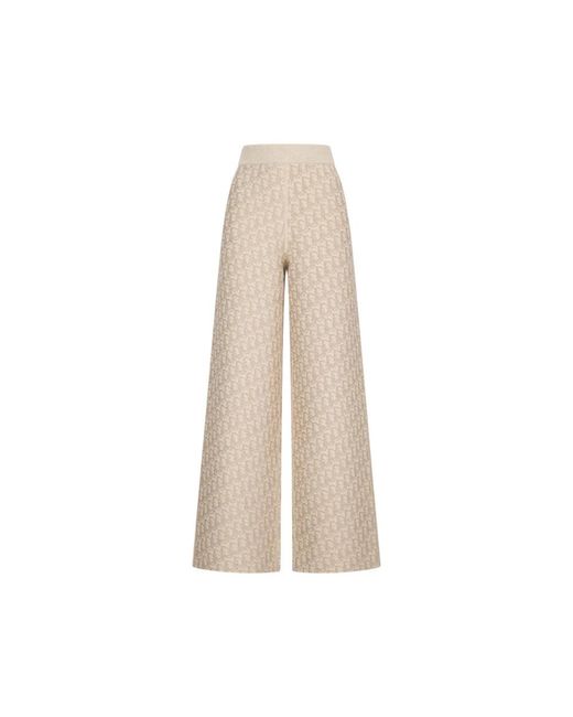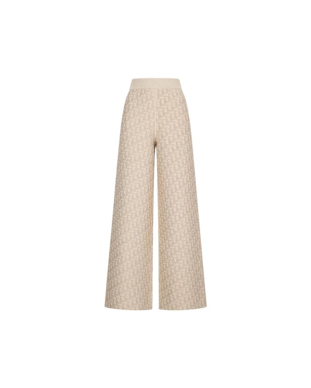 Dior Reversible Flared Trousers offer two distinct looks in one piece: a Dior Oblique motif side and a solid gold-tone reverse. Knitted in a metallic cashmere blend, they pair luxe texture with a wide, flared silhouette and an elastic waistband for comfort. Key attributes: Beige | Or Vieilli | Cashmere blend | Metallic finish | Soft feel | Slight stretch | Reversible design | Elastic waistband | Flared leg | Dior Oblique motif on one side | Christian Dior band down the leg | Dimensions & fit: Wide, flared fit | Composition & care: 85% cashmere | 7% viscose | 4% metal | 3% polyamide | 1% elastane | Dry clean only; handle gently. Colour: natural