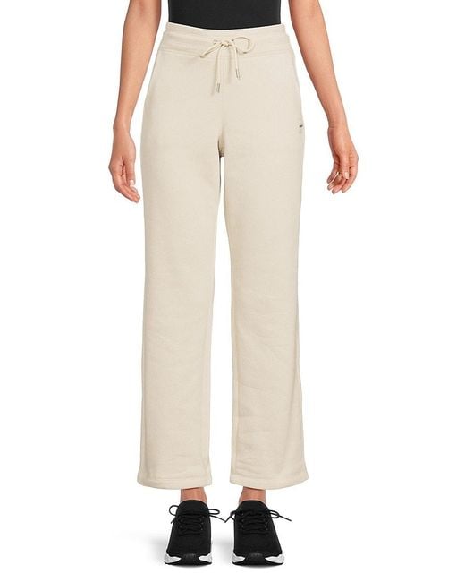 From DKNY these relaxed pants are crafted of a soft knit with a drawstring waist. Mid rise. Relaxed leg. Pulls on 60% cotton/40% polyester. Machine wash. Model measurements: 5'10" tall. Model is wearing a US. Small.