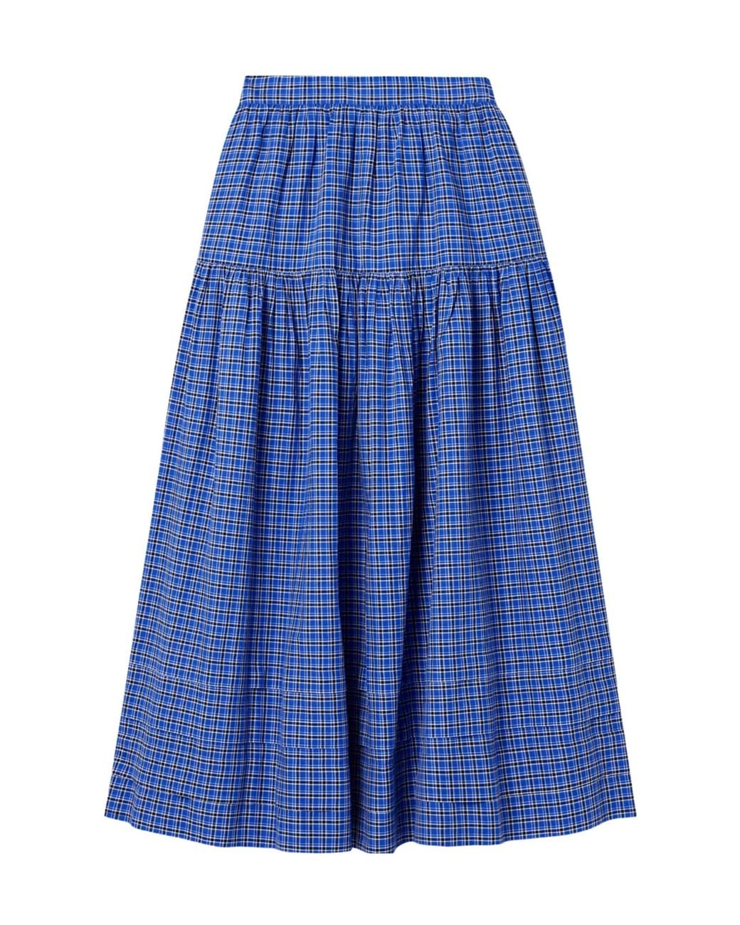 It features a plaid pattern, a flowing skirt, and a layered design. Colour: blue