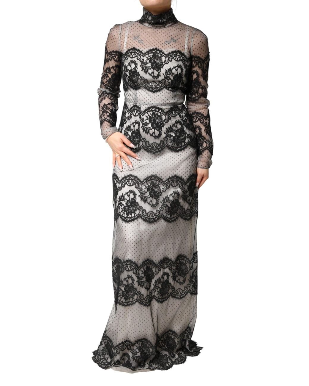 - Black White Lace Silk Blend Maxisheath Dress