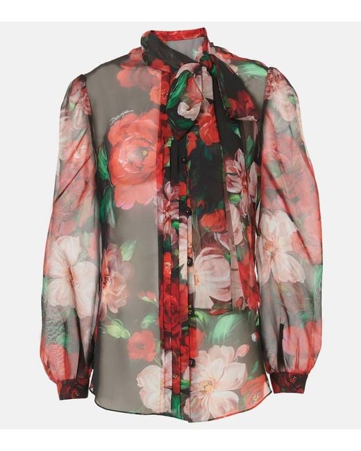 Women's Red Floral Tie-Neck Silk Organza Blouse