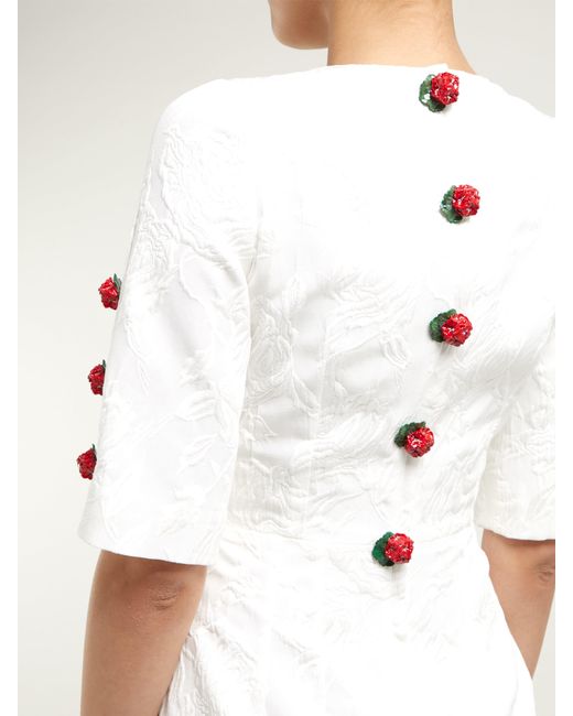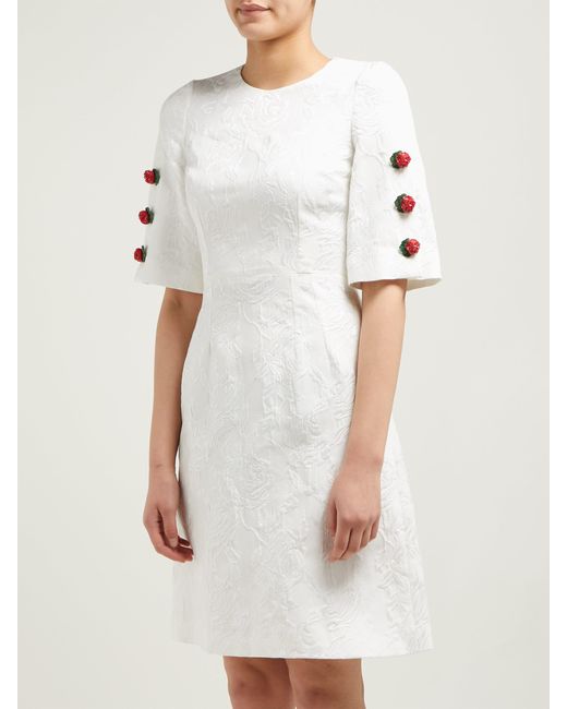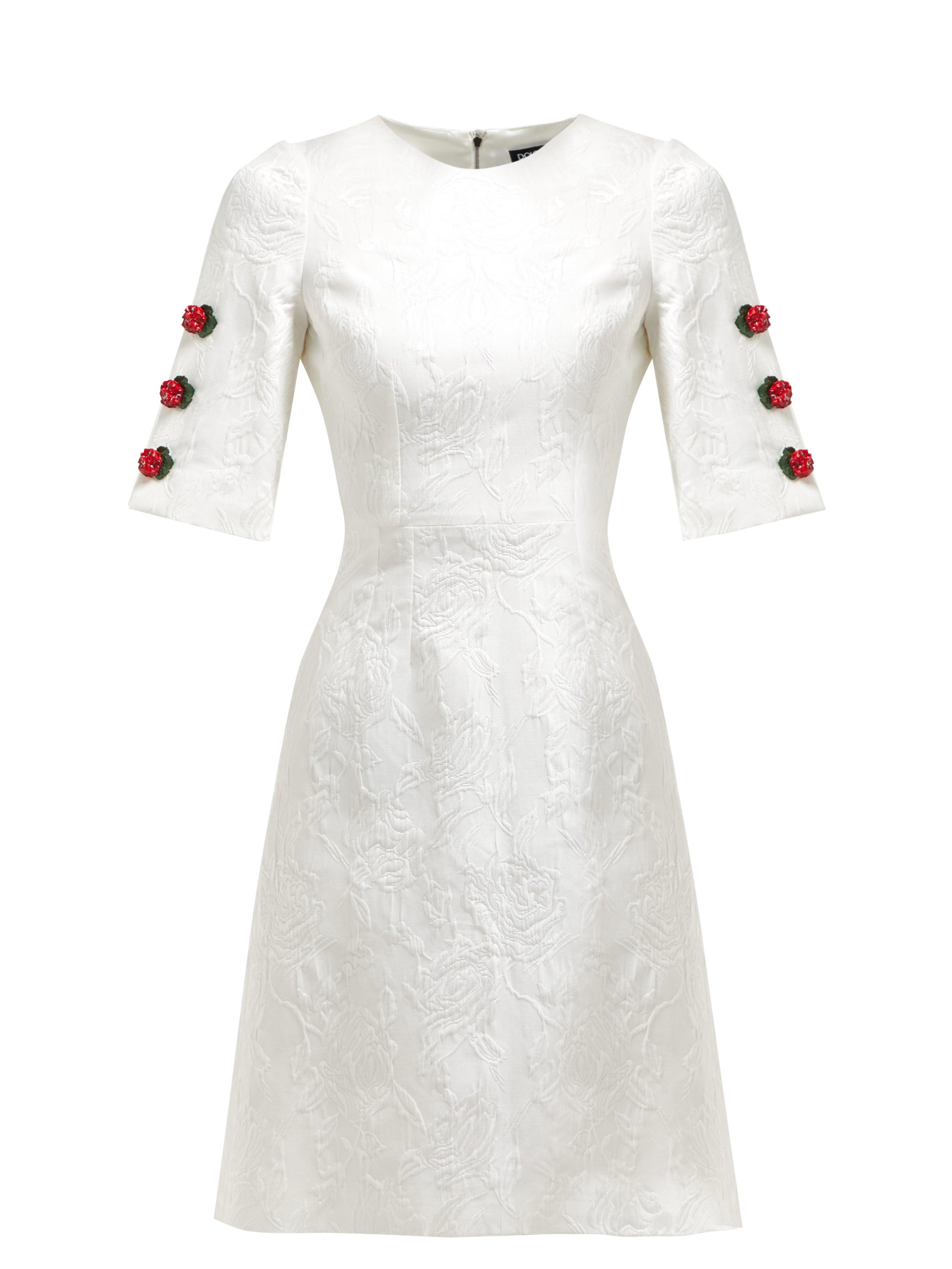 Marrying timeless romance with everyday elegance, this short and chic white dress from Dolce & Gabbana arrives with delicate red roses on the sleeves and down the back.