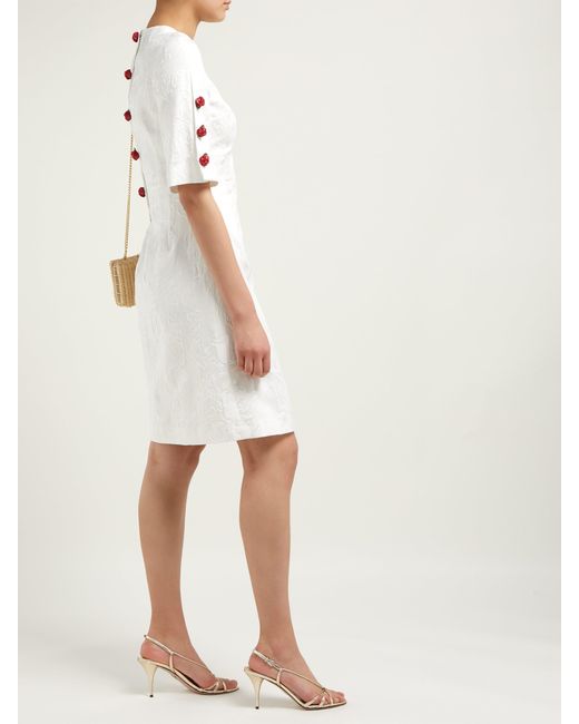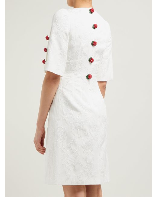 Dolce & Gabbana are the height of romanticism, femininity and Italian luxury. Along with bright colours and signature floral blooms, the designers behind the iconic brand are expert in fashioning timeless essentials for the woman of any age. This white cotton-silk blend floral jacquard dress features a round neck, a rear zip fastening, a knee length, a flared skirt and decorative buttons. Material:Silk/Cotton/Spandex/Elastane/Viscose.