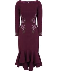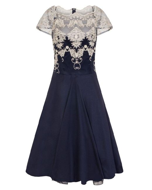 Chi Chi London navy midi tea dress featuring metallic gold embroidery, cap sleeves and zip fastening. 100% Polyester. Hand wash only. Model is 5'8 (176.8 cm) and wears a size 36. Colour: blue