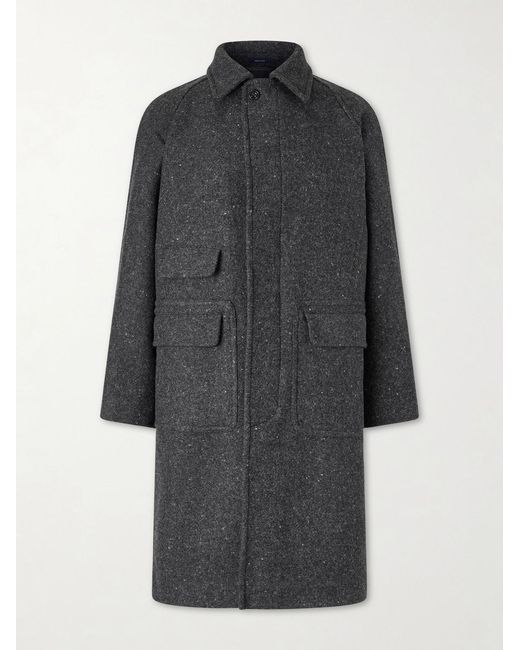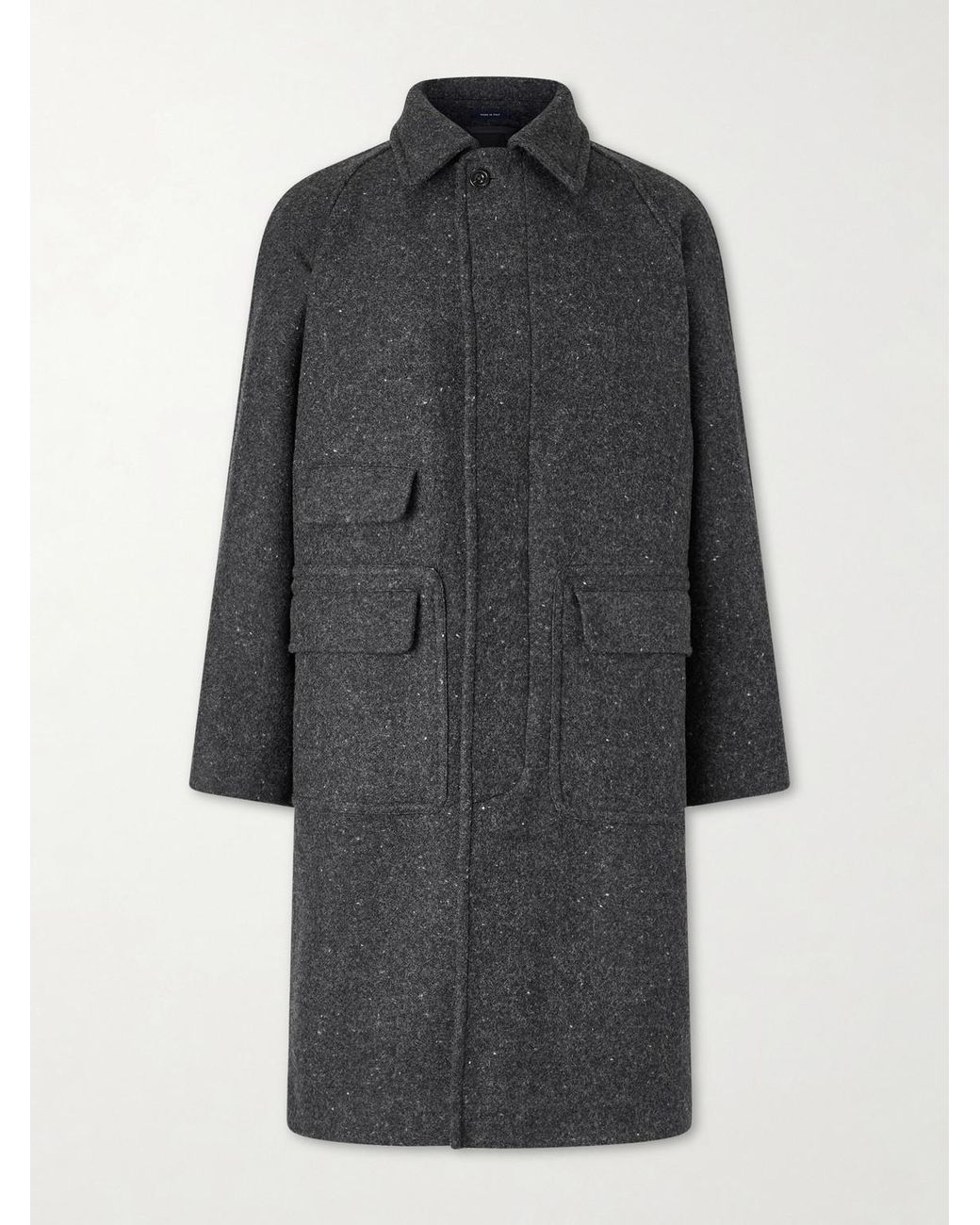 Naturally warm, Drake's coat has a speckled finish that lends character and depth to the virgin wool fabric. It has unstructured raglan sleeves and a trio of pockets at the front, with a dramatic back vent and horn buttons for a refined finishing touch.