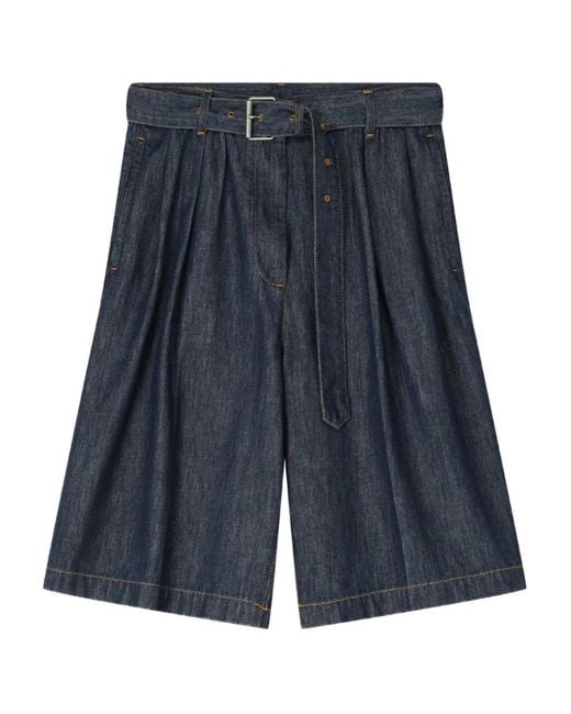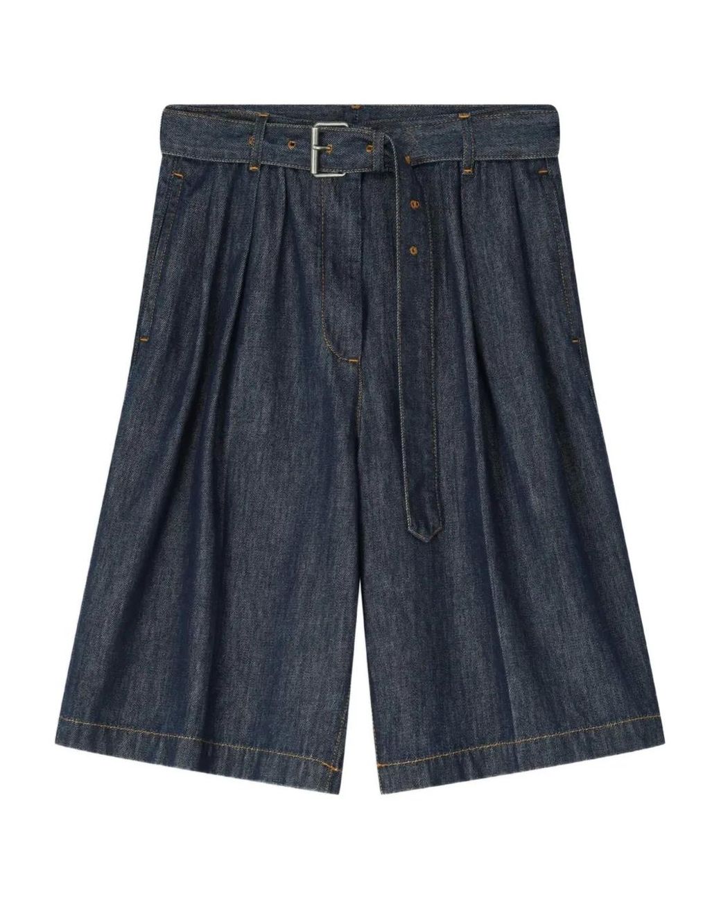 Denim Belted And Pleated Bermuda Shorts - Blue