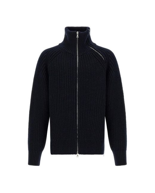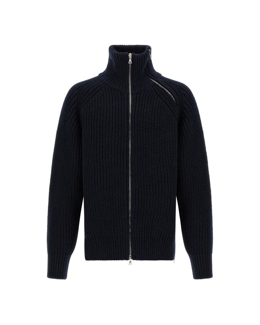 Dries Van Noten Monty Jumper is a rib-knit wool jumper defined by its front and side zip closures for versatile styling. It pairs a high neck with a structured silhouette for elevated cold‑weather layering. Key attributes: Blue | Wool | Front zip closure | Side zip closure | High neck | Long cuffed sleeves | Dropped shoulders | Ribbed texture | Composition & care: 100% wool Colour: blue