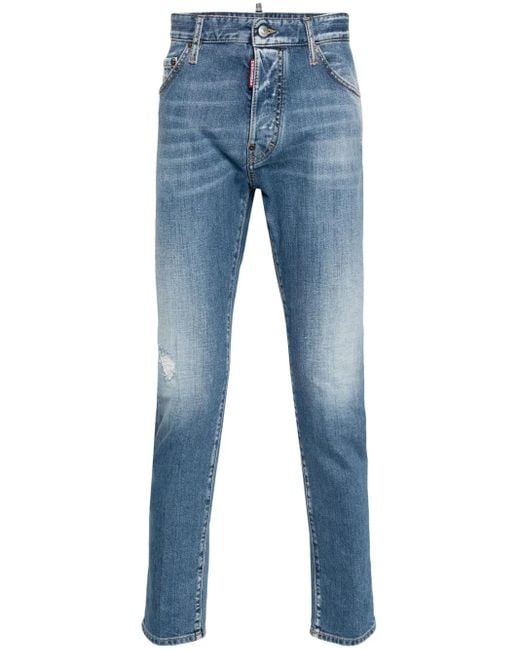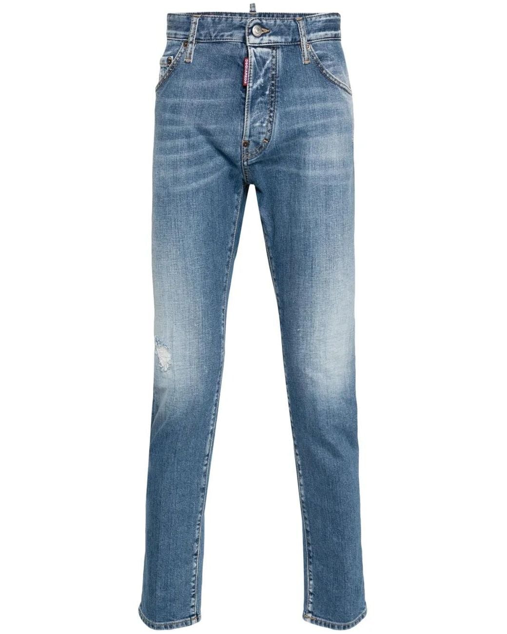 Light blue stretch-cotton mid wash faded effect whiskering effect at the thighs ripped detailing mid-rise belt loops mini logo tag classic five pockets logo patch to the rear slim cut button fly fastening Size: 46. Gender: Male. Material:Cotton/Spandex/Elastane/Polyester/Cotton.