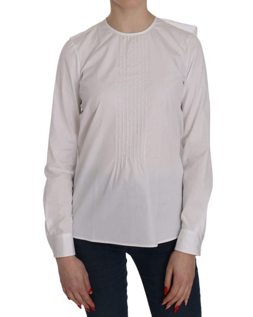 Women's Grey White Crew Neck Long Sleeve Cotton Blouse