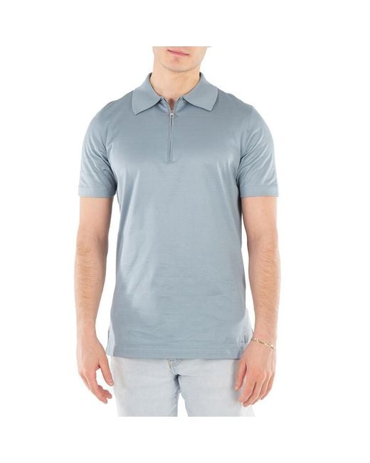 Dunhill Mens Tops. Fashion category: Polo Shirts. SKU: DU23FL206Y8450. Color: Blue. Dunhill Rib Collar Cotton Polo Shirt. This polo shirt features a zip at the centre front, a rib collar with a tubular attached zip guard, rib cuffs with a tubular attachment, side vents at the hem, and Dunhill longtail logo embroidery. 100% Cotton. Made In Italy. Colour: blue