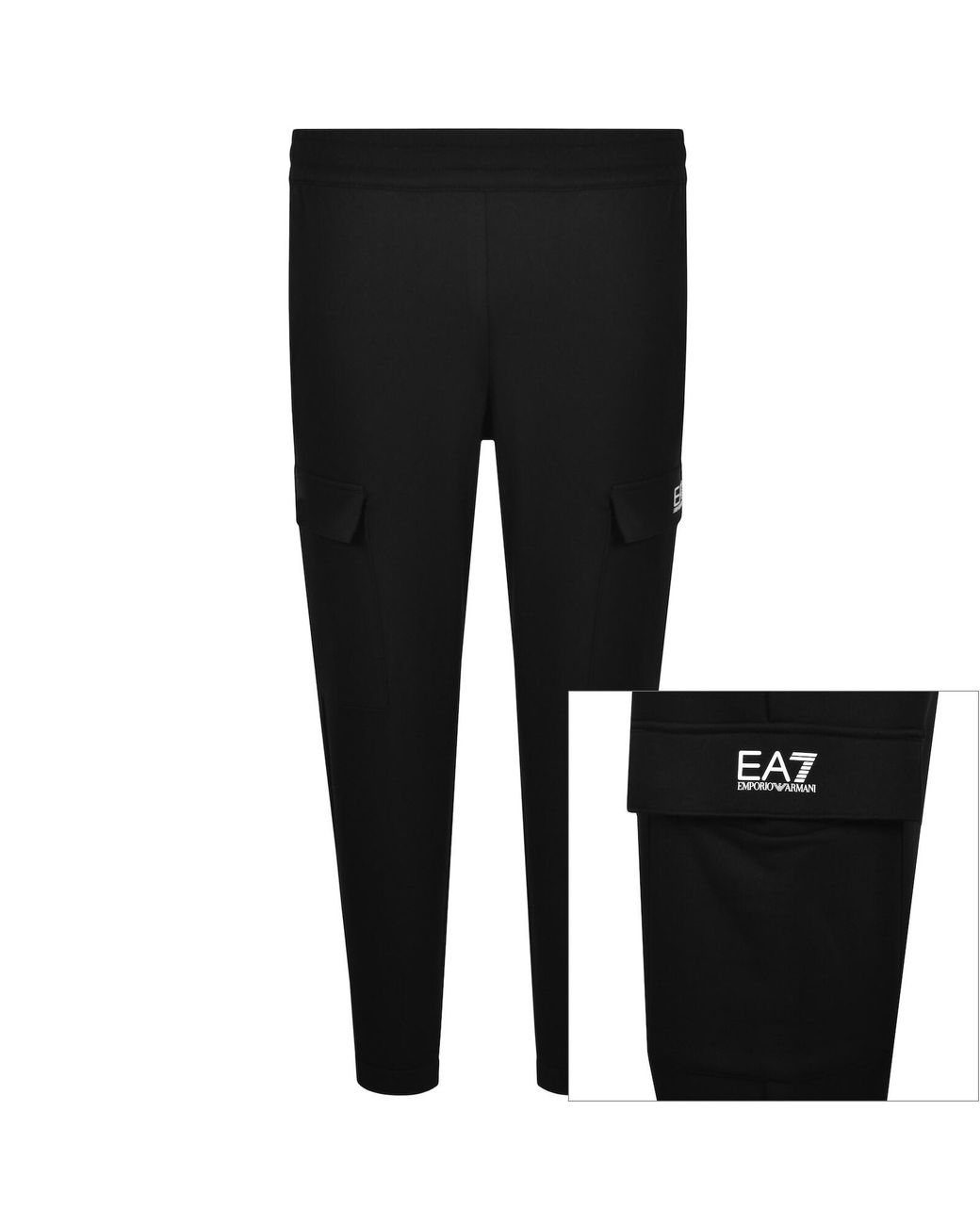 EA7 Emporio Armani Cargo Jogging Bottoms In Black. An elasticated waistband with a drawstring fastening on the interior. Two pouch pockets on the hips with two double press stud fastening thigh pockets and ribbed ankle cuffs. The signature EA7 Emporio Armani logo is rubberised on the left thigh pocket with the EA7 7 stripes logo on the reverse of the right hip both in white. A fleece interior. Fabric: 85% Cotton And 15% polyester. Rib Details: 96% Cotton And 4% Elastane. Colour: black