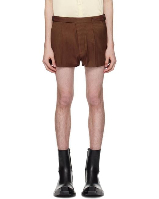 Plain-woven stretch virgin wool- and viscose-blend shorts. Pinstripes throughout. · Belt loops · Adjustable pin-buckle tabs at waistband · Four-pocket styling · Zip-fly · Pleats at front Supplier color: Brown stripes
