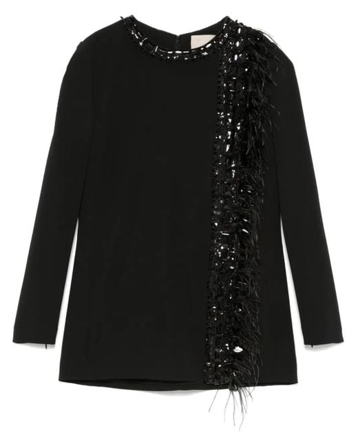 Black cady texture crystal-embroidered design rear zip fastening round neck feather-trim detailing long sleeves full lining straight hem thigh-length Size: 40. Gender: Female. Material:Viscose/Acetate/Elastane/Acetate/Silk. Colour: black