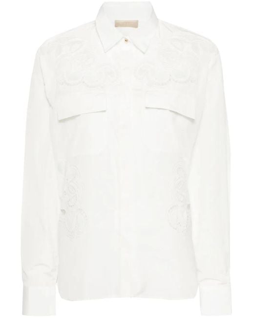 White embroidered design cut-out detailing classic collar two chest flap pockets concealed front button fastening long sleeves buttoned cuffs curved hem Size: 38. Gender: Female. Material:Polyester/Cotton. Colour: white