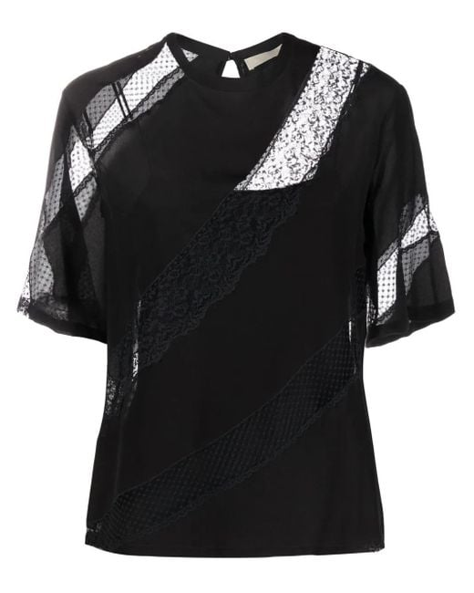 Black silk point d'esprit mesh lace panelling crew neck short sleeves keyhole detail to the rear Size: 36. Gender: Female. Material:Silk. Colour: black