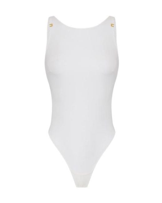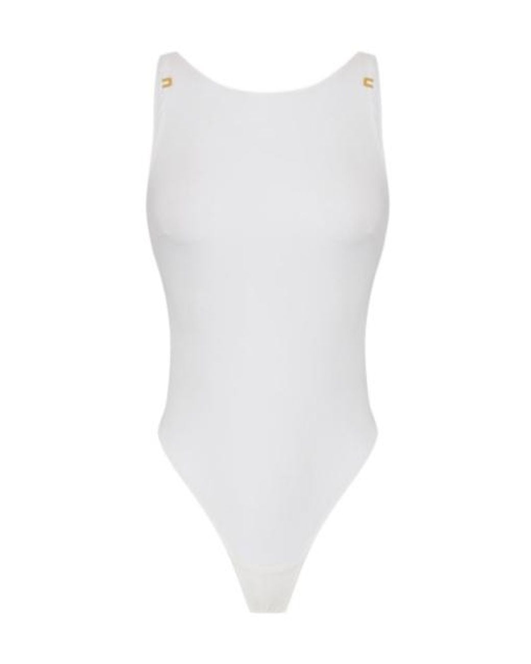 Sleeveless bodysuit in crêpe jersey fabric. With its simple line, it is decorated with golden metal logo details on the shoulders. Open back for a sensual touch. Slim fit. Colour: white