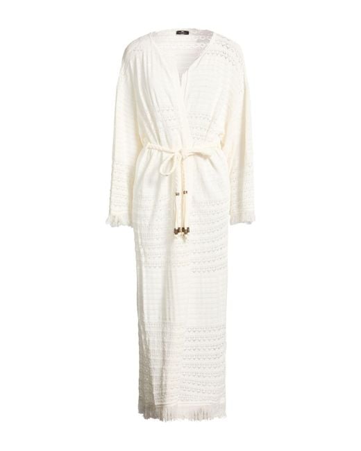 ELISABETTA FRANCHI. crochet-knit, mid-weight knit, belt, fringes, plain colour, long sleeves, tie fastening, dry clean, do not bleach, do not tumble dry, this brand runs small. 88% Viscose, 12% Polyester.