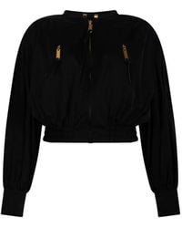 Go to Di SabatinoThe oversized nylon bomber jacket from Elisabetta Franchi makes a bold statement in contemporary fashion. It showcases a high fabric collar, voluminous sleeves, and a front zip closure. Striking gold-tone metal buttons and