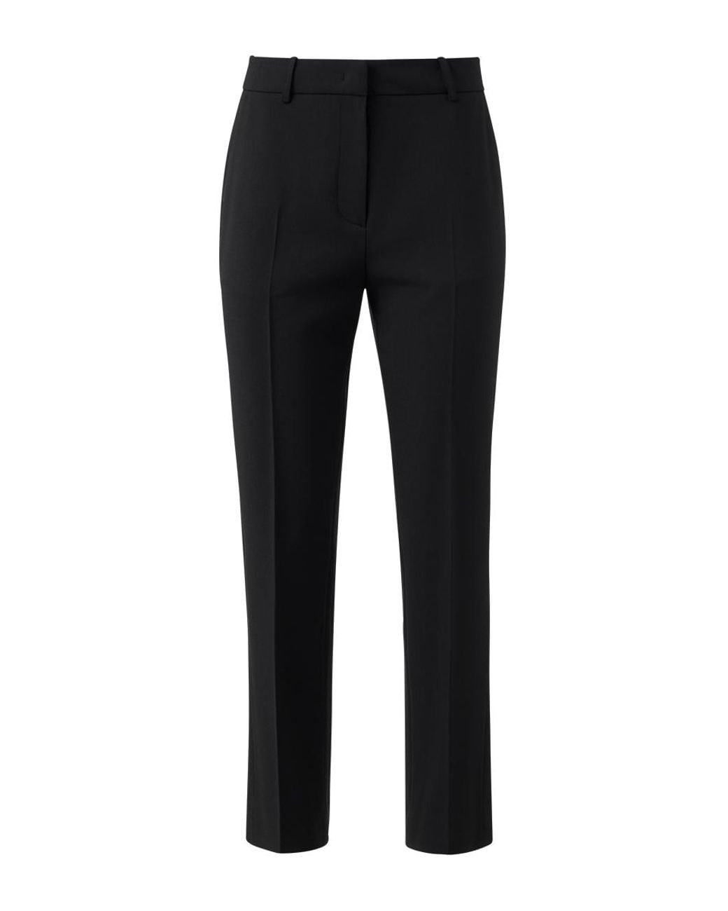 These tapered trousers are designed for a sleek, elongated silhouette with a softly structured fit. Tailored from a smooth polyester blend with a hint of stretch, they sit neatly at the waist and taper to a streamlined leg. Featuring belt loops, discreet side and back pockets, and a seamless front fastening, they offer effortless sophistication for any occasion. Material: 96% Polyester, 4% Spandex Lining: 57% Polyester, 43% Cupro Mother of Pearl Button Gentle cold hand wash separately Colour: black