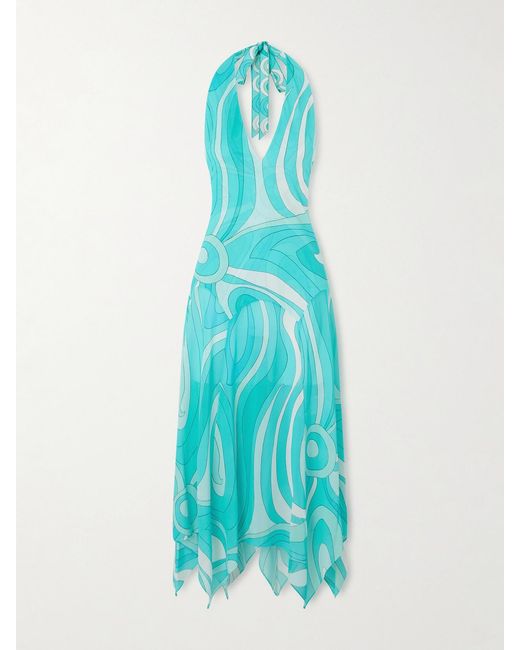 Women's Blue Printed Silk Twill-Trimmed Crepe-Jersey Halterneck Midi Dress