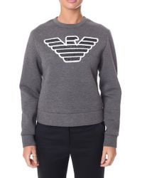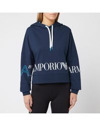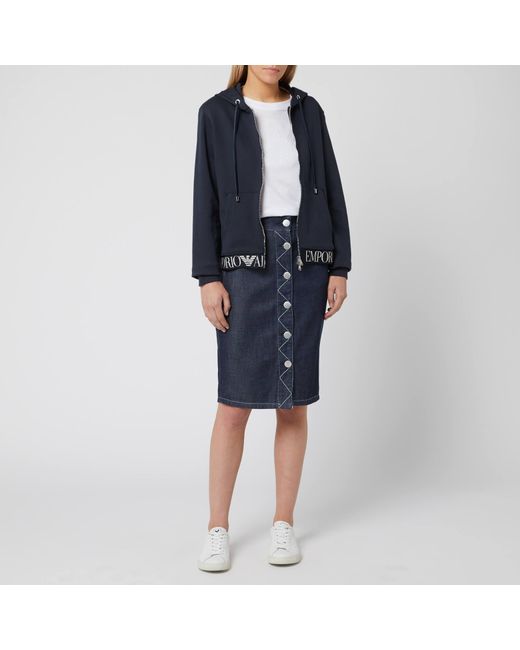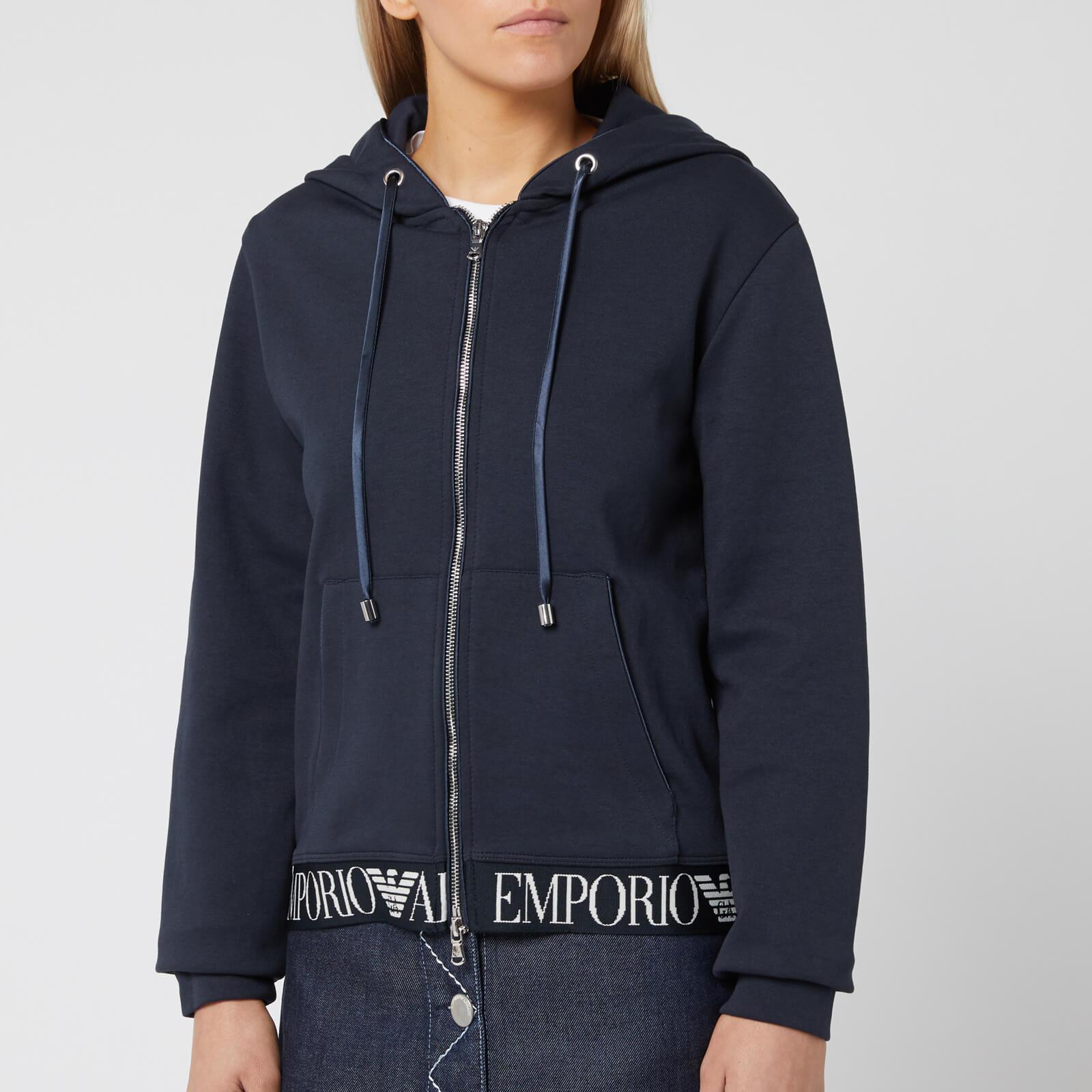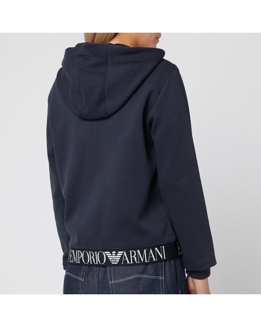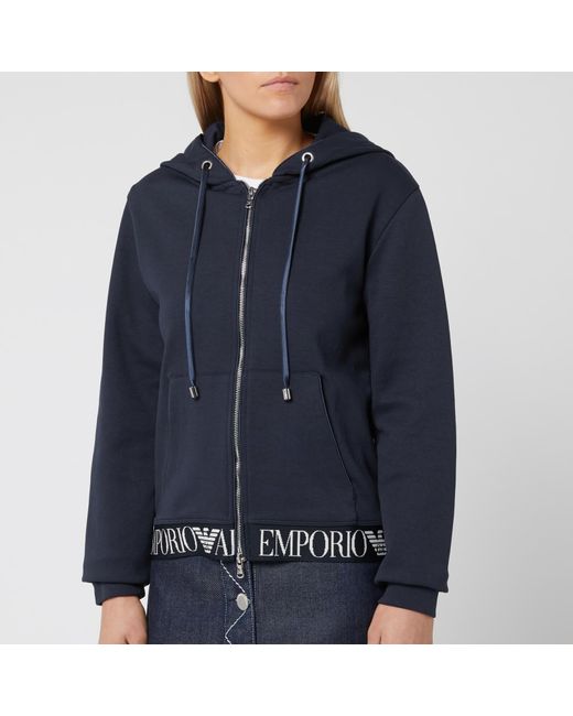 Navy zip hoody from Emporio Armani. Cotton blend jersey. Two-way zip closure. Drawstring adjustable hood. Split kangaroo pocket. Elasticated hem with contrasting branded. Ribbed cuffs. Silver-tone hardware. Main: 71% Cotton, 29% Polyester. Hem: 87% Polyester, 13% Elastane. Model is 171cm/5'7.5 and wears a size IT 40. Colour: blue