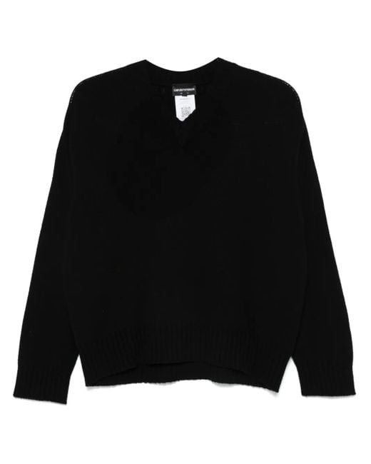 Black virgin wool-cashmere blend fine knit ribbed trim V-neck drop shoulder long sleeves straight hem Size: M. Gender: Female. Material:Cashmere/Virgin Wool.