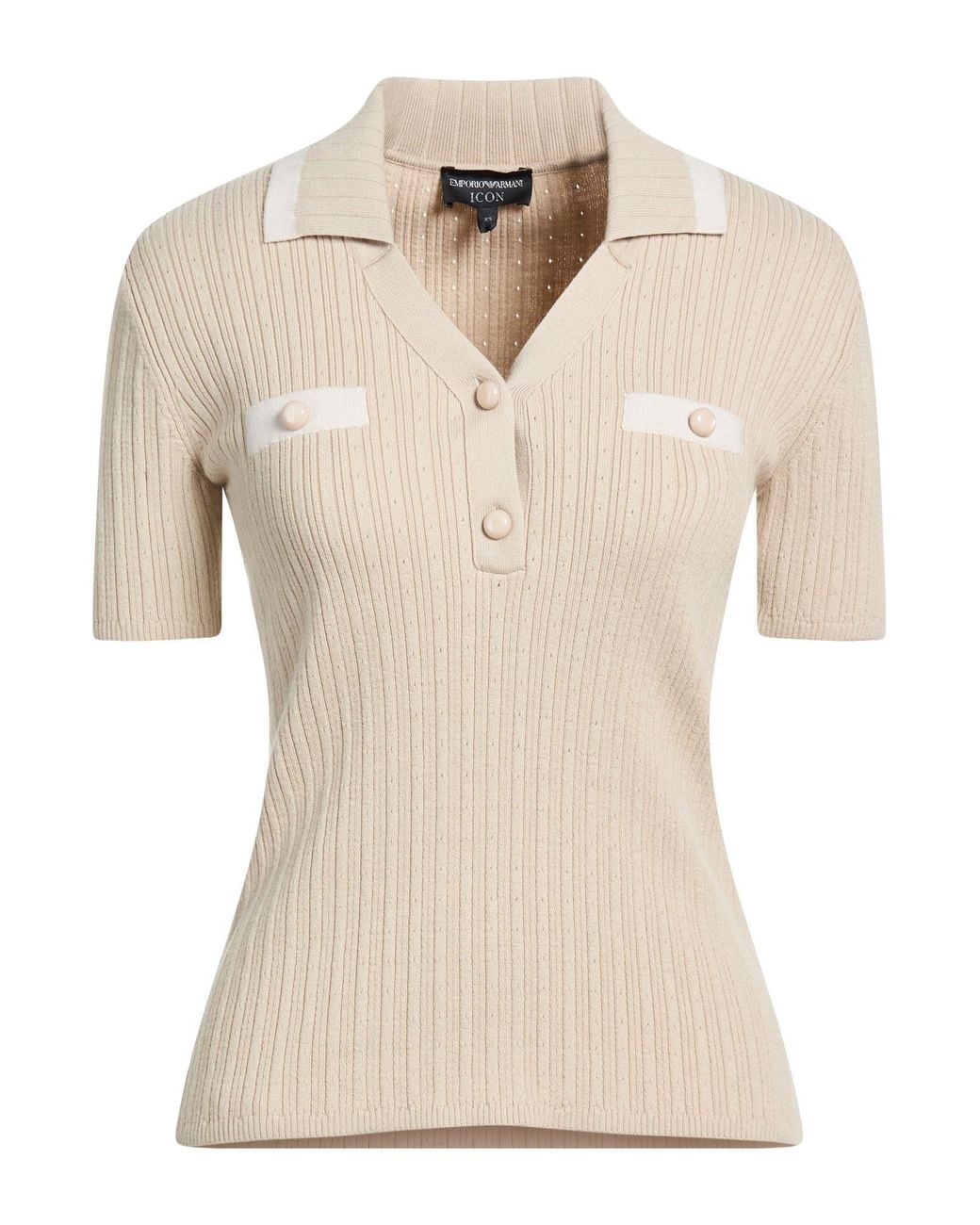 EMPORIO ARMANI. ribbed jersey, stretchy fabric, plain colour, knitted trims, buttoned neckline, short sleeves, hand wash or dry clean, do not bleach, do not tumble dry, this brand runs small. 72% Cotton, 13% Cashmere, 11% Polyamide, 4% Elastane.