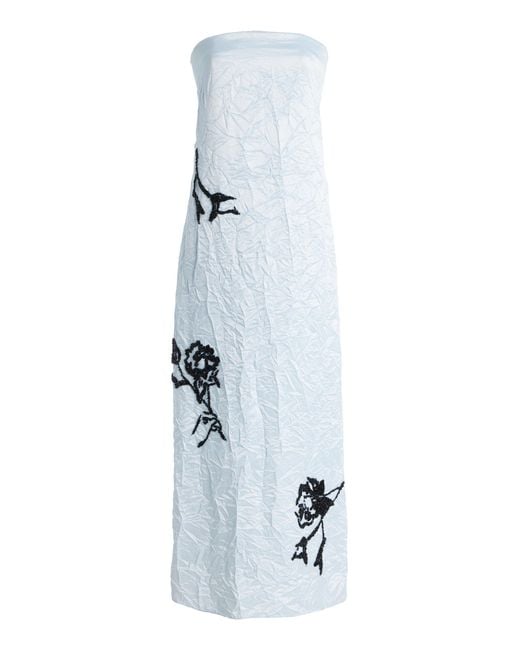 Women's Blue Embroidered Crinkled Satin Midi Dress
