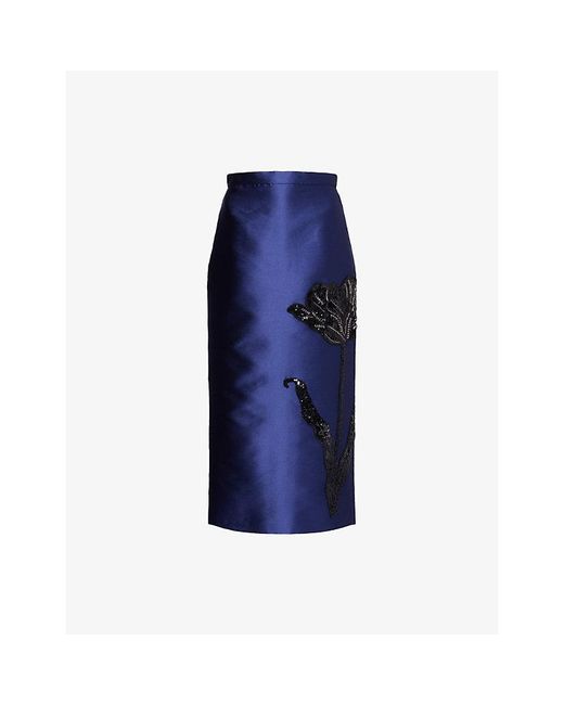 Erdem satin midi skirt85% polyester, 15% silkConcealed hook-and-eye and zip fastening at backRegular fit, mid-rise, embroidered floral motif at sideDry cleanMade in PortugalTrue to sizeSize UK 8; length 36.5in / 93cmModel is 5ft 10in/1.78m and wears a size UK 8Midweight, non-stretch Colour: blue