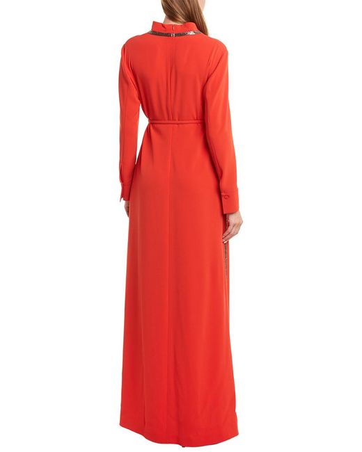 This item tends to run large (based on Member feedback). We recommend sizing down for your best fit. Color/pattern: melon. Approximately 62in from shoulder to hem. Measurement was taken from a size 38 and may vary slightly by size. Model is 5ft 10in. Design details: mock collar, split neck, beaded trim, button cuffs, vented front hem, removable belt at waist. Centre back zipper. Shell: 83% triacetate, 17% polyester. Trim: 100% silk. Dry clean only. Colour: orange