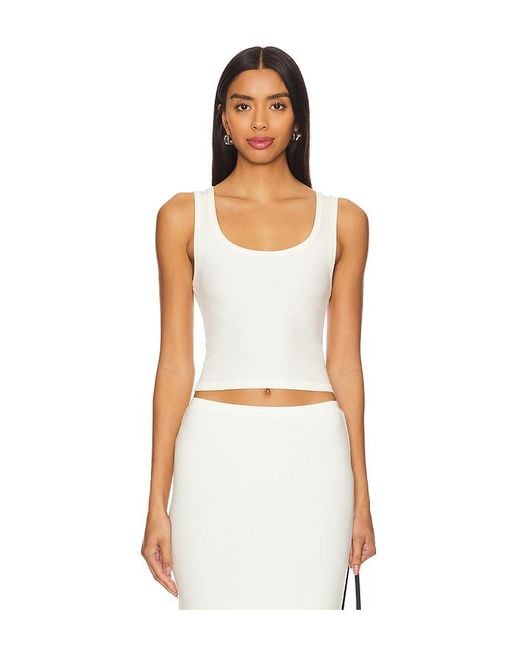 Eterne Square Neck Tank Top in Cream. Size L. Also in XL. Eterne Square Neck Tank Top in Cream. Size XL. 48% cotton 48% modal 4% spandex. Machine wash. Cropped fit design. Ribbed knit fabric. ERNE-WS17. CB344-04.