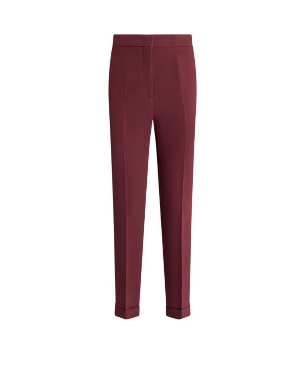 Cigarette trousers with pressed creases and cuffs at the bottom. This model is made from stretch cady fabric. Cigarette fit Regular-rise waist Hook and zip closure Side pockets Rear welt pockets The model is 70.07" (178 cm) tall and wears a size 40 (IT) Made in Italy Colour: red