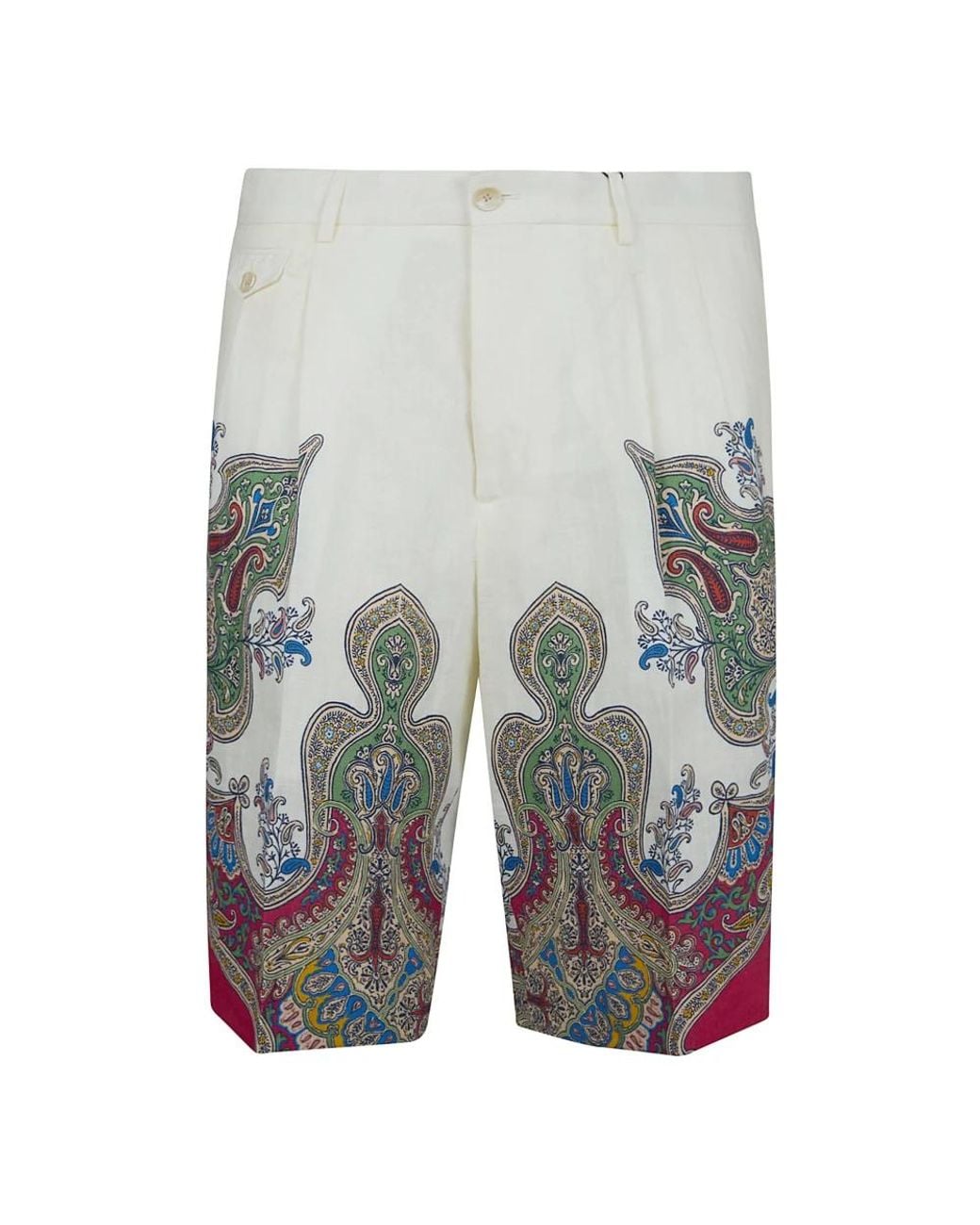 Etro Linen Shorts with Placed Pocket-Square Paisley Print pair lightweight linen construction with a bold paisley-and-floral placement for a standout warm-weather piece. Designed for everyday wear, they combine a tailored silhouette with multiple pockets for practical use. Key attributes: Multicolor | Linen | Button and concealed zipper closure | Front slant pockets | Side pocket with buttoned flap | Back welt pockets with button | Placed paisley print enriched with floral details | Placed pocket-square print | Dimensions & fit: Regular fit | Composition & care: 100% linen | Pocket lining: 100% cotton | Dry clean only
