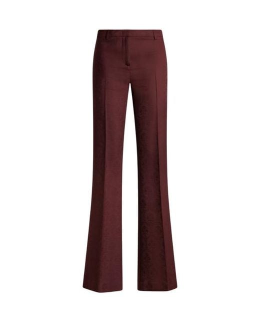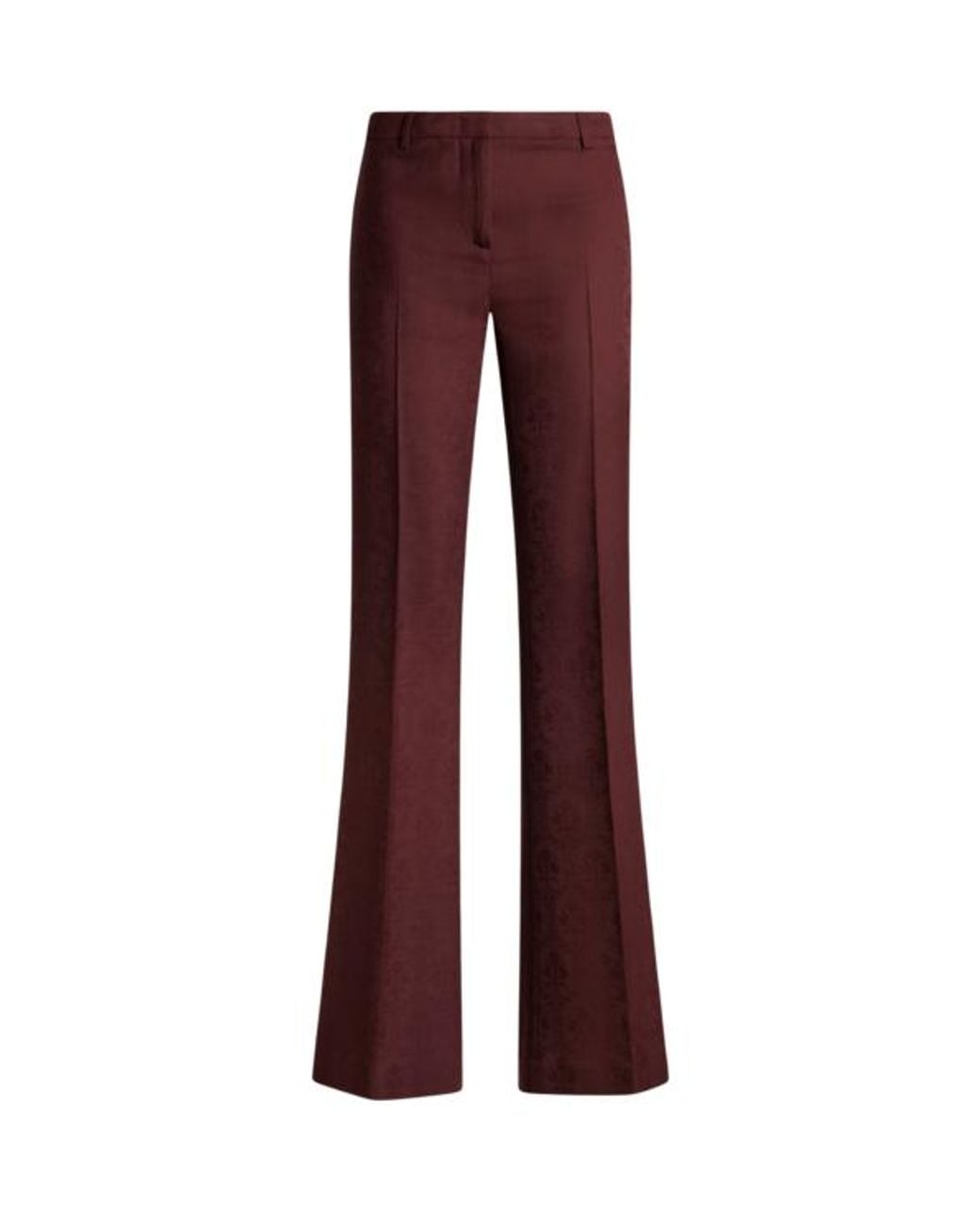 Flared trousers with pressed crease detail, made from fresh wool jacquard fabric with tone-on-tone floral motif. The item was presented at the Autumn-Winter 25 Runway Show. Slim fit Regular rise Concealed hook and zip closure Rear welt pockets Made in Italy The model is 5' 9½" (176 cm) tall and wears a size 40 Colour: purple