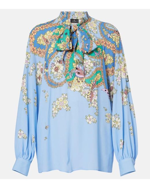 Scarf-Detailed Floral-Print Silk-Organza Blouse - Blue